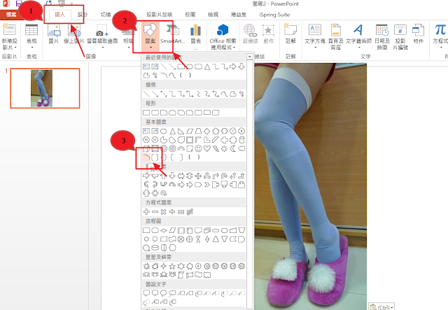 1-1點按上方工具列『插入』/『圖案』/『弧形』